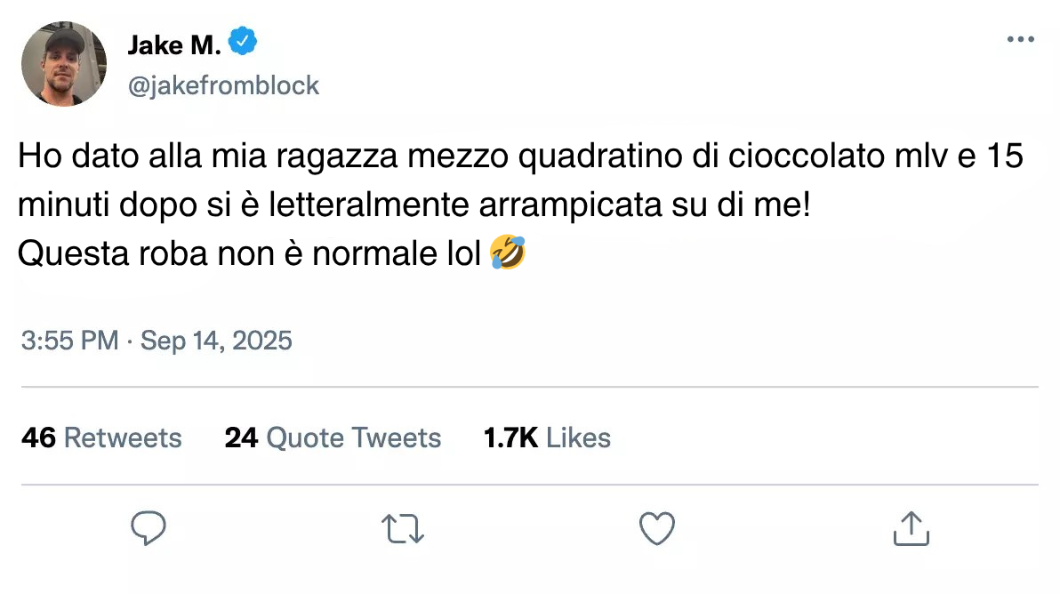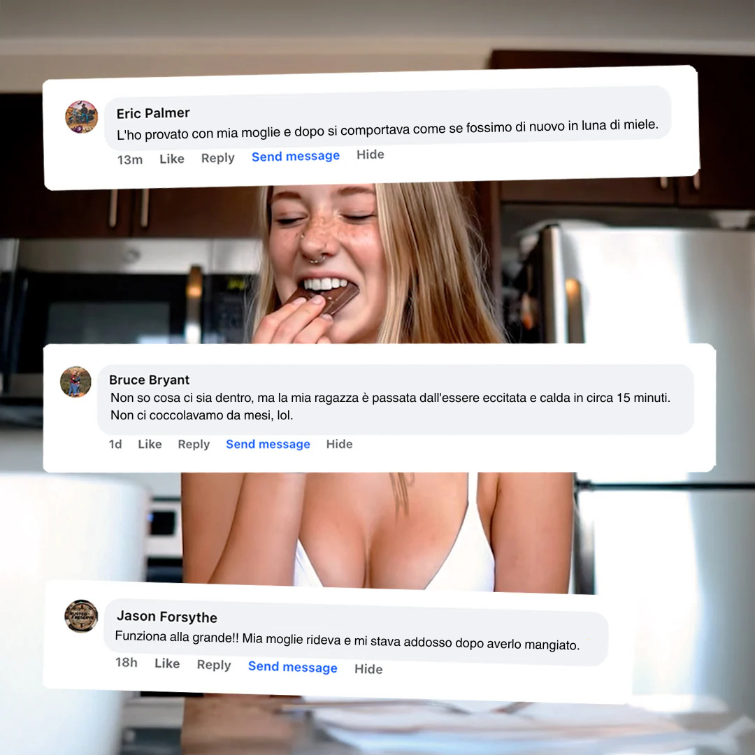 Non mi aspettavo molto da un "cioccolatino dell'umore", ma wow, funziona. Ne ho condiviso una barretta con la mia ragazza prima di un appuntamento serale e l'energia tra noi è salita di livello. Continuava a ridere, a toccarmi di più e diceva che ero "straordinariamente carino". Ne comprerò sicuramente ancora prima che finisca.