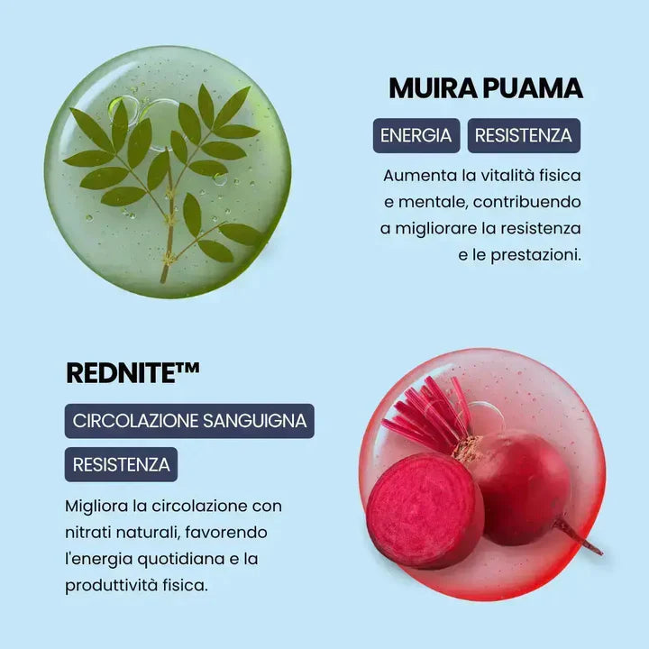 Ingredienti come Muira Puama, RedNite™ e Ashwagandha lavorano meglio con un'assunzione continua, portando a risultati duraturi in termini di energia, resistenza e benessere mentale.